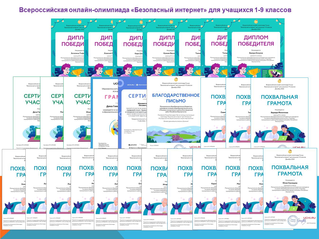 Мы живем в век информационных технологий, достаточно много времени проводим в сети в поисках информации, готовясь к урокам, или просто отдыхая. Мы общаемся с друзьями, участвуем в дискуссиях, обсуждаем новости, оставляем комментарии, выкладываем фотографии. Очень важно научиться правильно вести себя в сети Интернет, знать правила безопасности и этичного поведения. Организованная на образовательной платформе "Учи.ру" Всероссийская онлайн- олимпиада "Безопасный интернет" для учеников 1-9 классов позволила обратить внимание учащихся на возможные угрозы в сети Интернет, повысить грамотность учащихся в вопросах безопасности в сети, формировать общепринятые нормы поведения в сети. В школе все старшеклассники не только изъявили участвовать в интернет олимпиаде, но бурно включились в волонтерскую деятельность дпя привлечения к участию в олимпиаде младшеклассников.В результате 97,5 % учащихся школы в январе от образовательной платформы "Учи .ру"за участие во Всероссийской онлайн- олимпиаде "Безопасный интернет получили 7 дипломов победителя,13 похвальных грамот, множество сертификатов ,благодарственные письма нашей школе и школьному организатору Мухаметовой Н.Х.